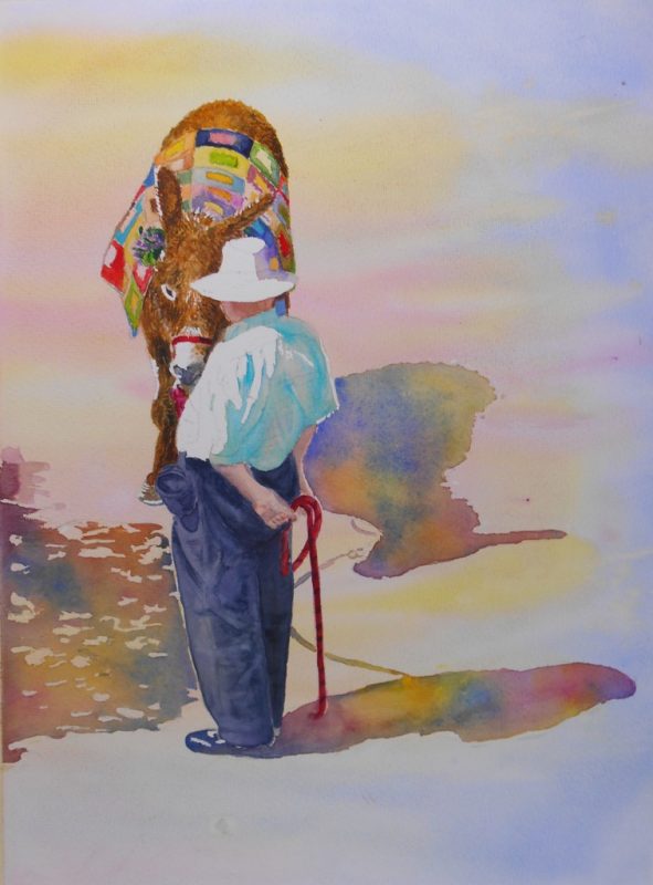 - Wet the two shadow areas behind the man and the donkey and drop in yellow, Quinacrinode Magenta and Ultramarine Blue. Then move the paper and allow the colours to mix and blend into each other, taking care not to let the colours run outside the shapes. Let it dry.