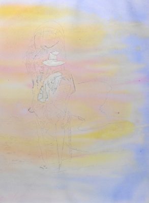 - While the masking fluid is drying, paint the face and arms of the man with a mixture of Quinacridone Magenta and Burnt Sienna.