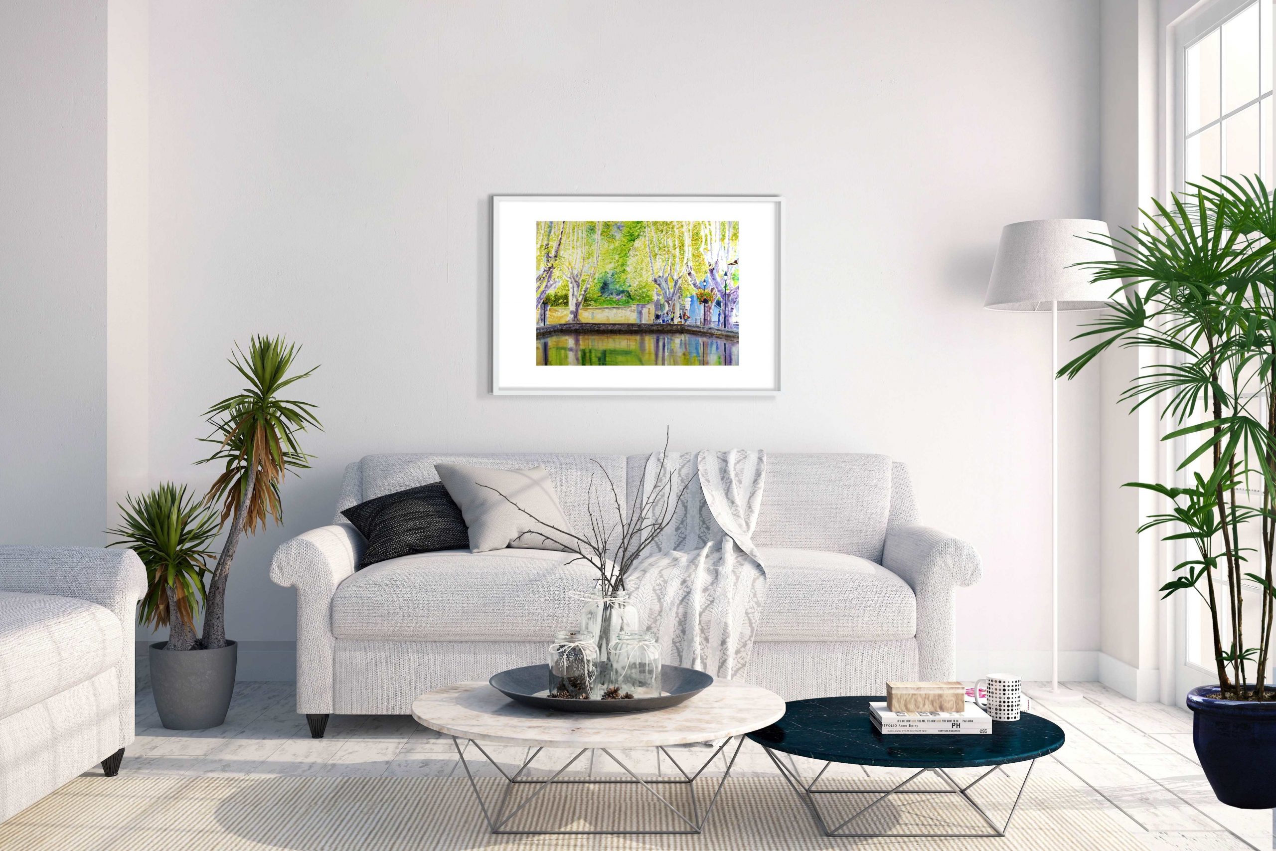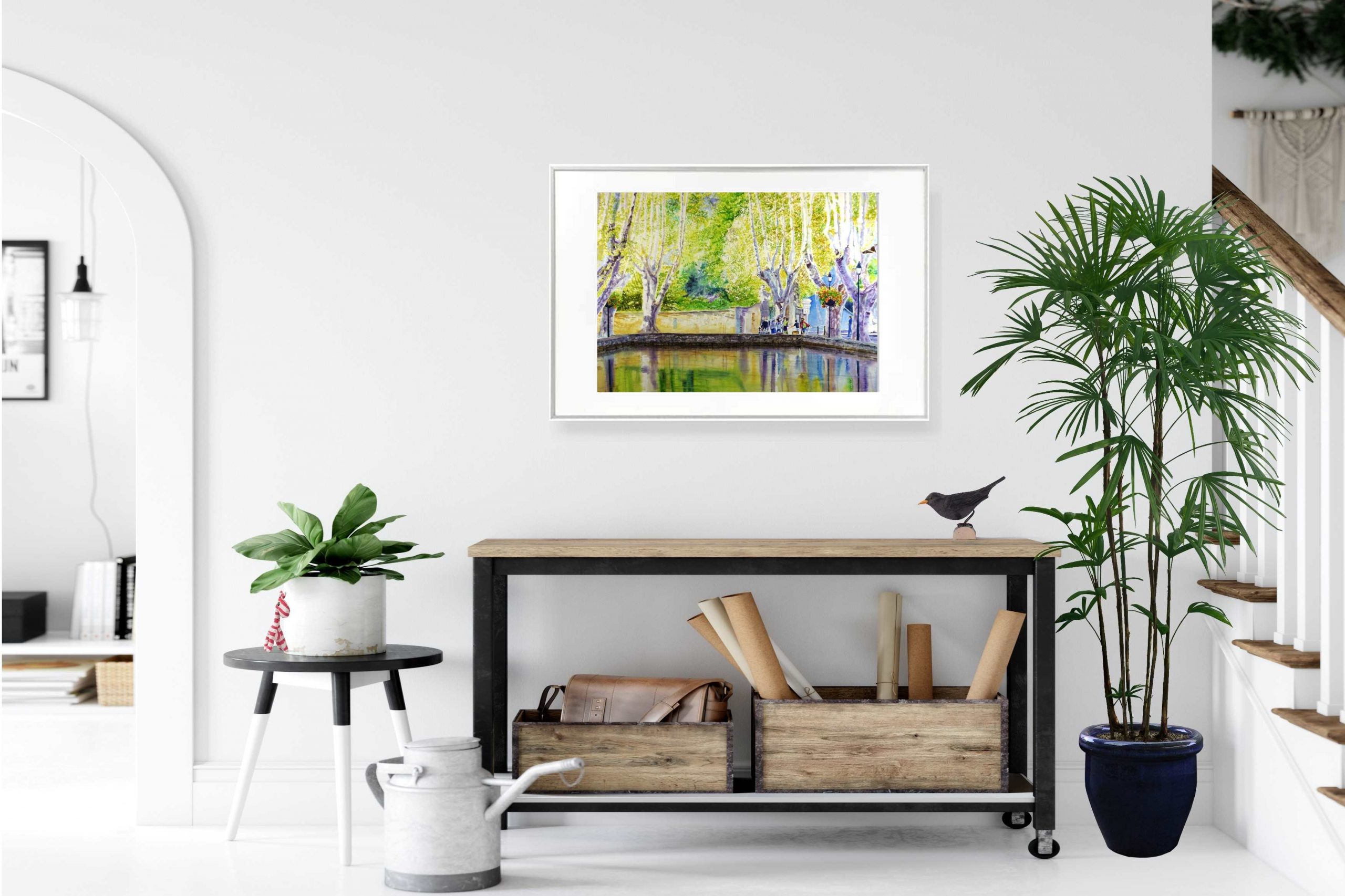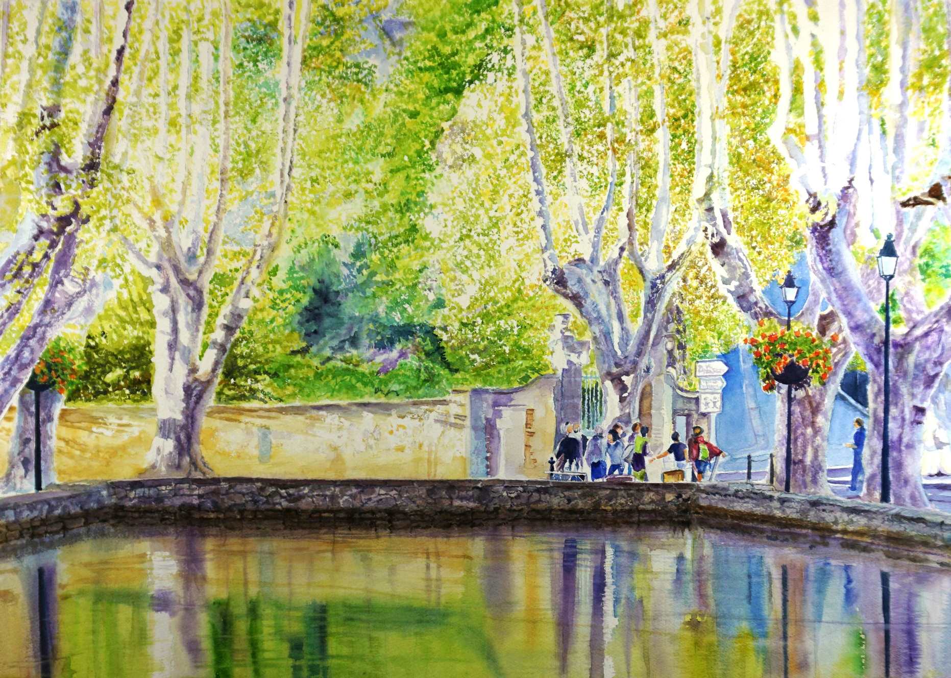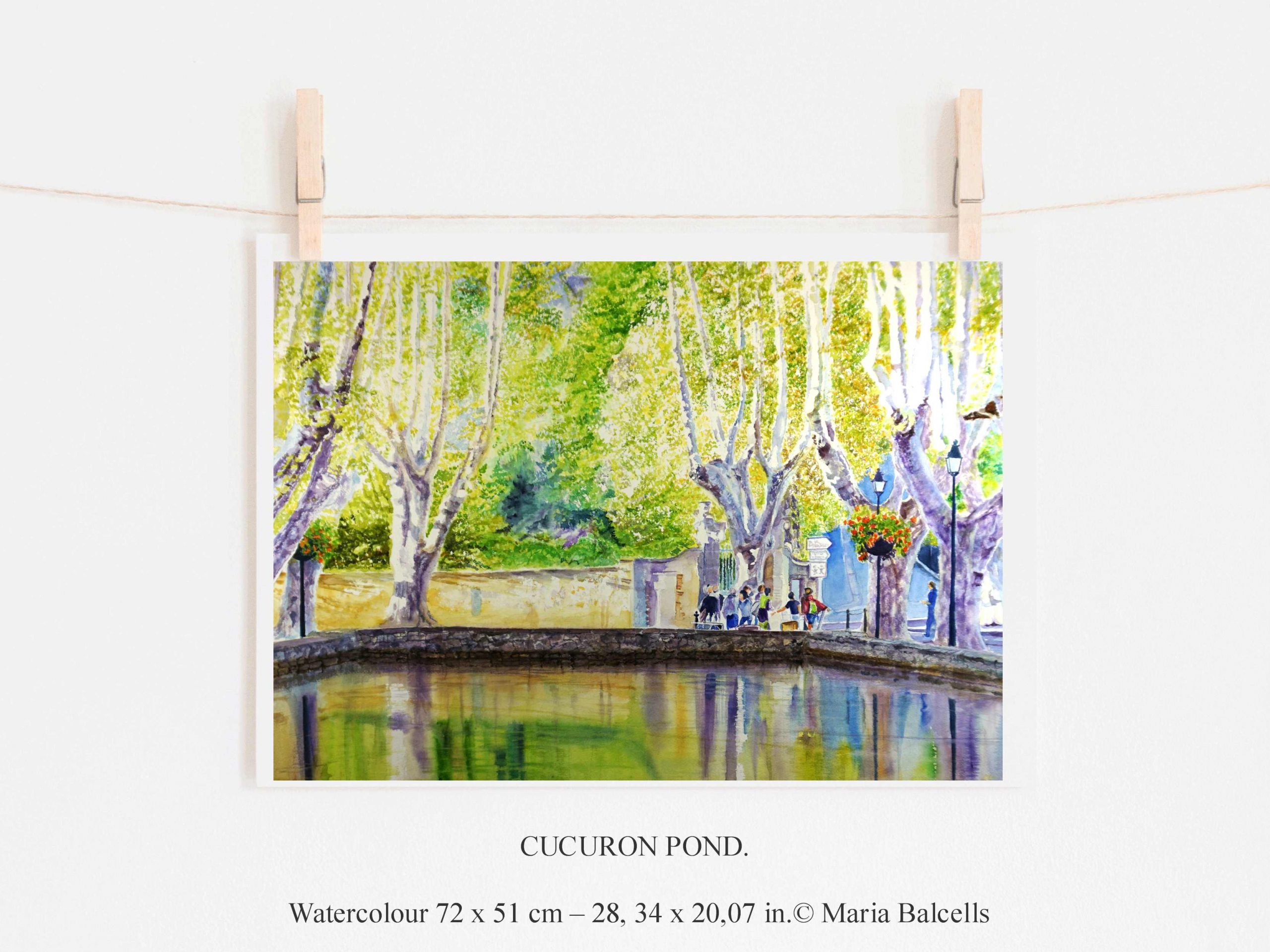 CUCURON is a small village and one of the most beautiful villages in La Provence. There is a big pond surrounded by old trees. Around the pond, they are a few bars and restaurants. One day, a week there is a regional market where to buy all kinds of things, and as the day I painted this scene of a group of people painting the pond and its water reflections.