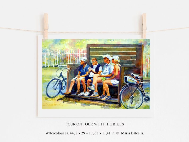 Watercolour summer and figurative landscape painting of a group of friends having a lunch break cycling after a tour with the bikes. The view of the scene invites you to call a couple of friends, jump on the bike and do the same.