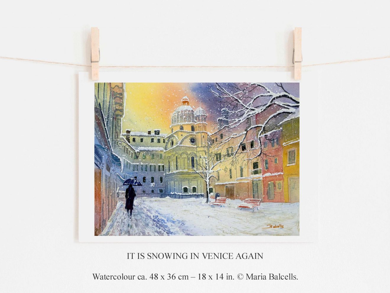 It is snowing in Venice again, is a watercolor street scene with the Basilica in the background. The streets are empty, and the houses, and streets around the Basilica are white. A quiet and relaxing atmosphere is in the air despite the low temperatures, no tourists, no noises, just the noise of a few steps on the snow.