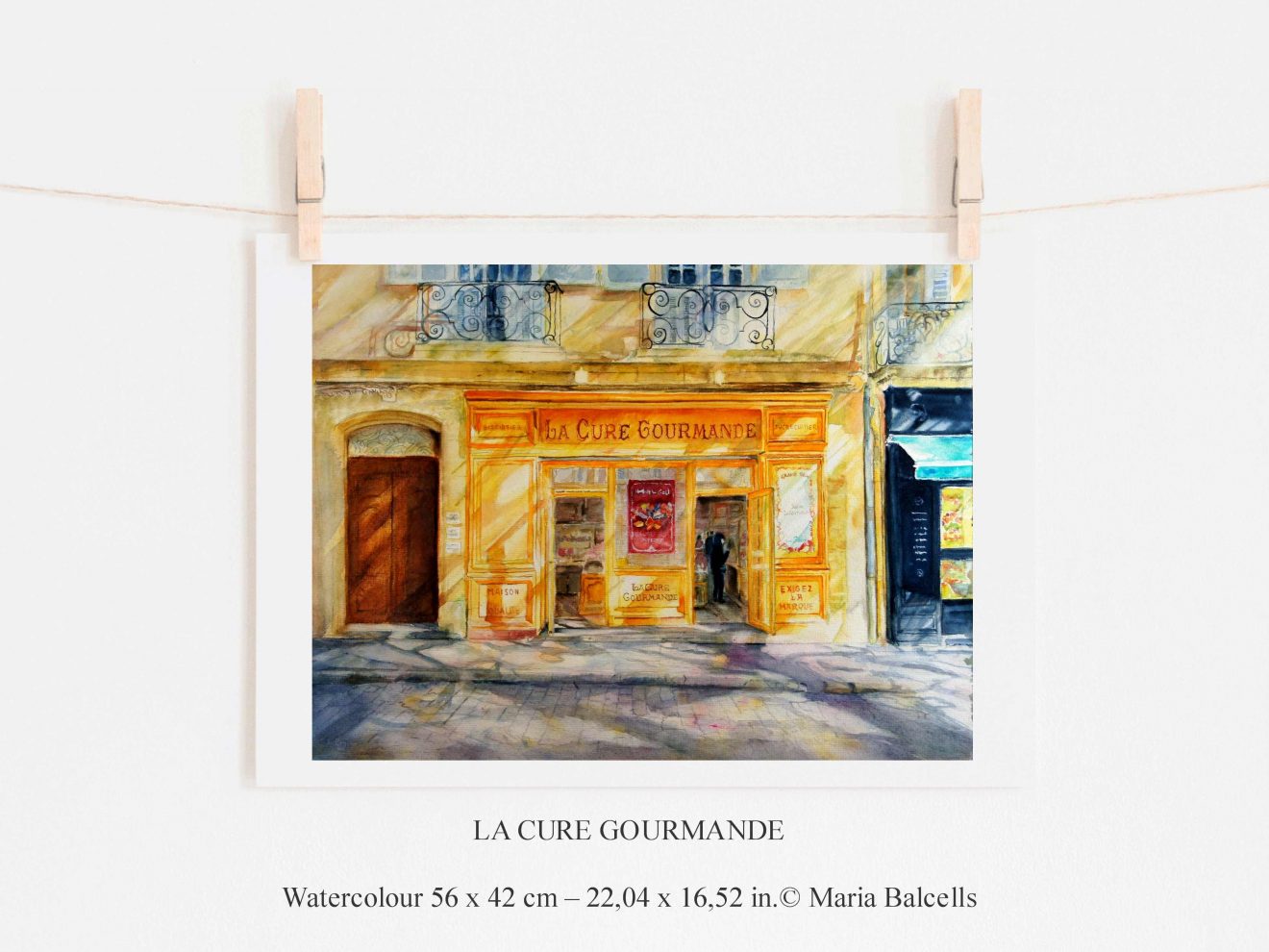 The one I have painted is placed here, and the day I was there, the sun was going through the foliage of the big trees of the square, illuminating the shop with its yellow colours. I could not resist and made a painting out of it.