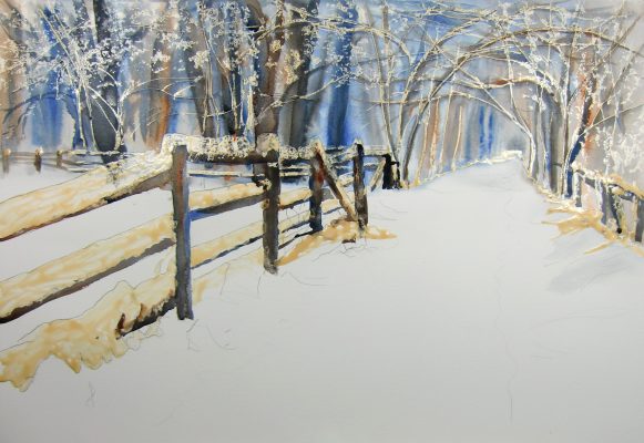 - Mask the snow over the fence and some tree trunks and branches with the synthetic brush. Do not forget to count up to 20; by 21 you must rinse your brush again in clean water!